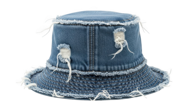 Blue denim bucket hat with distressed frayed edges and white thread detail image