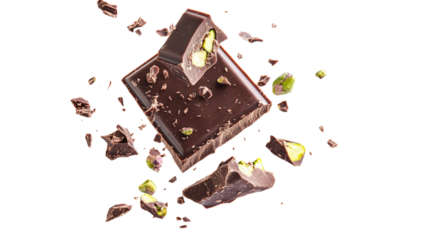 Dark Chocolate Pieces with Pistachios Floating on a Transparent Background