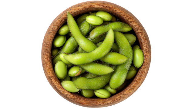 Overhead Shot of Edamame in a Wooden Bowl Against Black Background