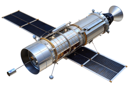 High-resolution transparent cutout of a space telescope showcasing intricate design and solar panels in a vivid layout. Cut out