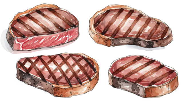 Grilled steaks displayed on a white background with varying levels of doneness and grill marks