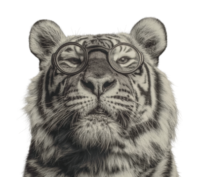 Whimsical portrait of a tiger with glasses digital humorous concept isolated on transparent background
