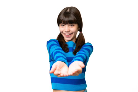 Teenager caucasian girl over isolated background holding copyspace imaginary on the palm to insert an ad
