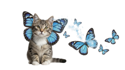 Adorable Tabby Kitten Composite with Large Blue Butterfly Wings and Flying Blue Butterflies isolated PNG with Transparent Background
