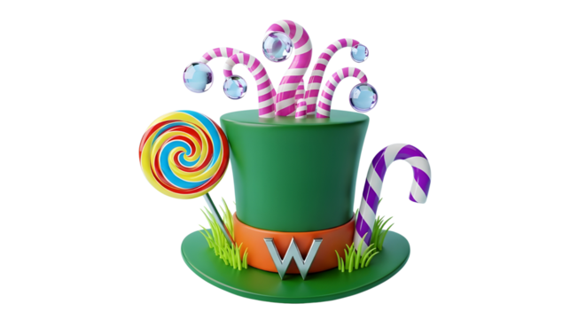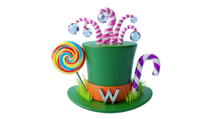 Cute 3D whimsical green top hat filled with sweets and colorful lollipop decorations. isolated PNG with Transparent Background