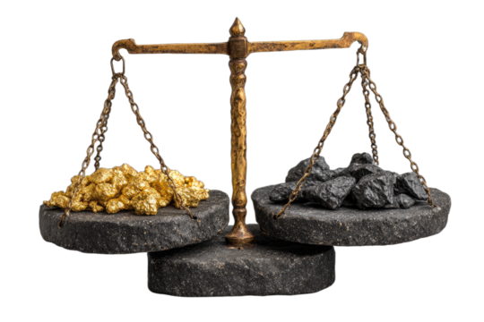 Vintage scale balancing golden nuggets against black coal chunks