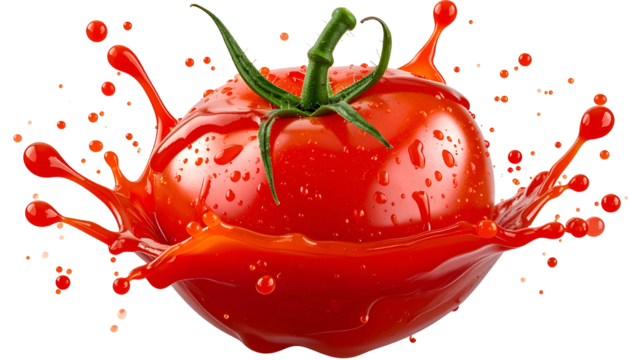 A vibrant, ripe tomato with a green stem, immersed in a splash of juice