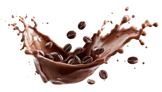 Coffee beans submerged in a splash of rich, brown liquid against a black background