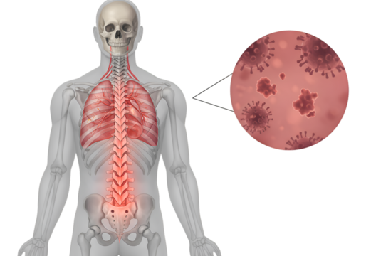 Human respiratory system anatomy illustration, highlighting potential infection or inflammation in the lower back region, with magnified virus particles.