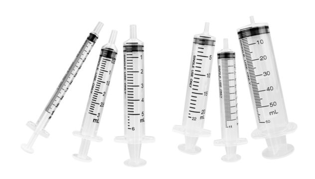 collection photograph of various transparent syringes with visible measurements on a transparent background, suitable for medical and scientific contexts.