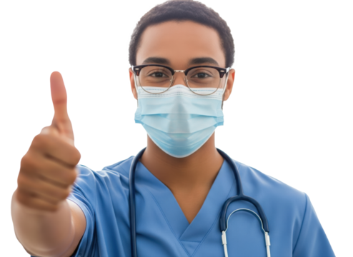 Young male nurse wearing scrubs, glasses, and a protective mask giving a thumbs up to promote safety and trust in healthcare.