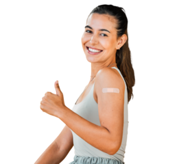 Woman, thumbs up and vaccine promotion with portrait, plaster on arm and covid isolated on png transparent background. Female person, corona immunization support and smile, healthcare and solution