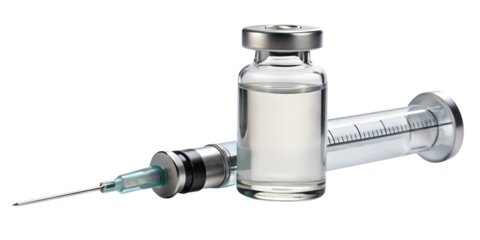 A medical vial and syringe isolated on transparent background, prepared for a vaccine injection