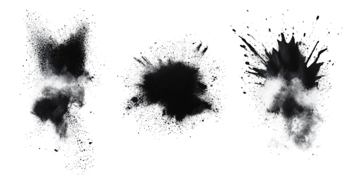 three distinct black paint splatters or ink blots showcasing varying shapes and sizes ideal for graphic design backgrounds or artistic projects