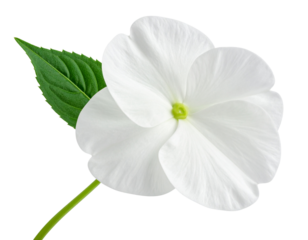 Side View of White Impatiens Bloom with Curved Stem and Leaves, Isolated
