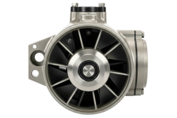 Automotive water pump component for engine cooling system, showing impeller and housing detail, isolated on a transparent background PNG (पानी पंप)