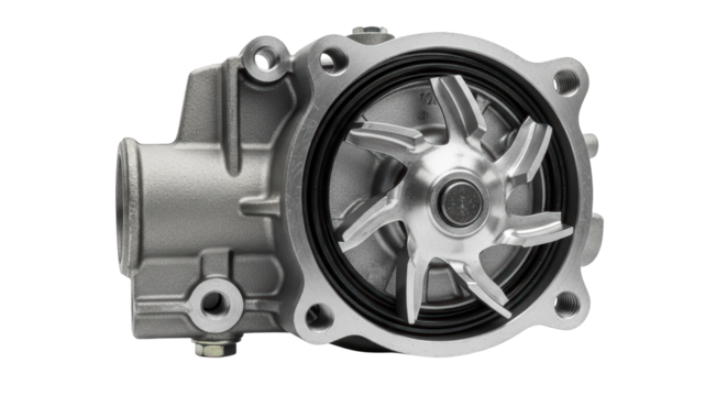 Detailed automotive water pump showcasing its shiny impeller blades and metal casing isolated
