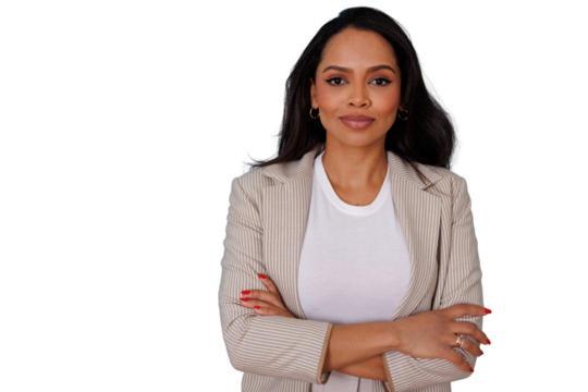 Businesswoman standing with arms crossed, portraying professional confidence and leadership on transparent background