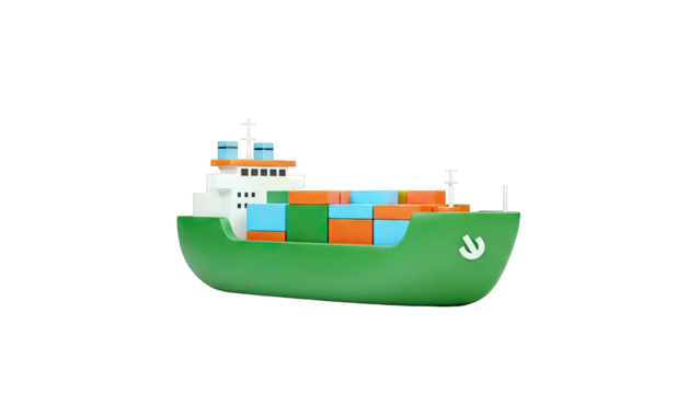 Green shipping container being lifted by crane red containers stacked beside it isolate
