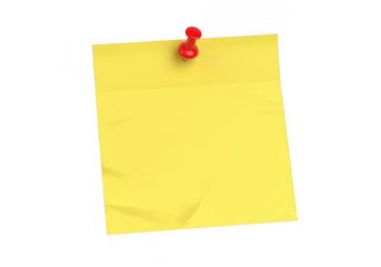 Bright yellow note paper pinned securely with a red thumbtack for reminders transparent background