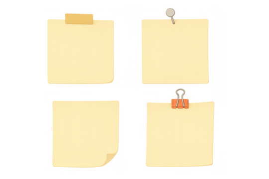 Yellow sticky notes with pushpin, binder clip, and adhesive tape, organizing reminders and tasks, transparent background