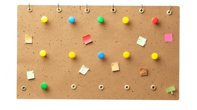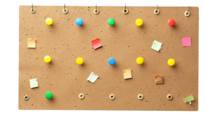 Cork bulletin board with colorful push pins and small paper notes, organized for reminders and messages.