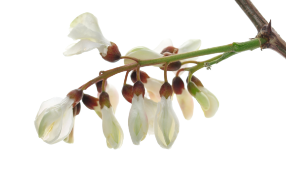 Close up blossoming acacia, single flower, isolated on white background, black locust, Robinia pseudoacacia