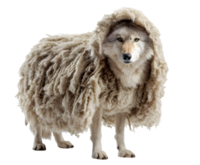 Wolf in Sheep's Clothing: A conceptual, captivating visual narrative where a wolf is cleverly disguised within the woolly exterior of a sheep, highlighting deception.