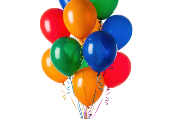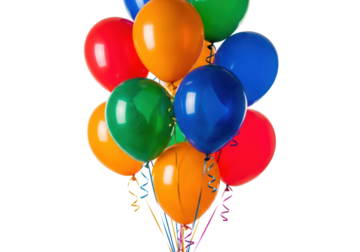 twelve vibrant glossy helium balloons (red, orange, green, blue) with trailing metallic ribbons, isolated on a high-key studio white background, shallow dof. festive joy concept