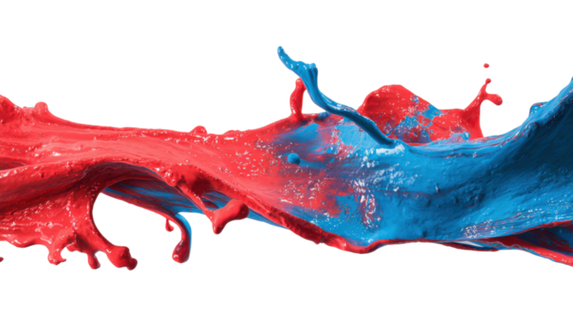 Red and blue paint splashing and merging, creating a dynamic liquid motion on transparent background