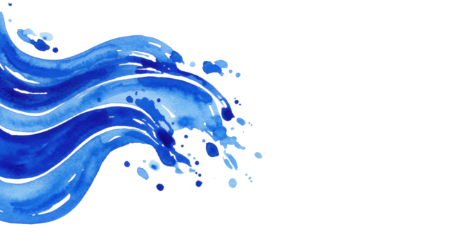 Abstract watercolor flowing water and waves in sapphire, indigo, and azure blue, showing translucent washes on white textured paper with copy space, concept of fluidity and natural serenity