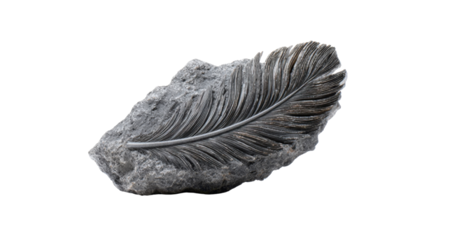 Feather fossil imprinting on a gray rock, studying paleontology and ancient bird feather remains, transparent background
