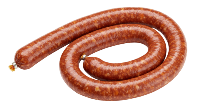 Smoked sausage ring isolated on transparent background, delicious cured meat for charcuterie boards and gourmet food