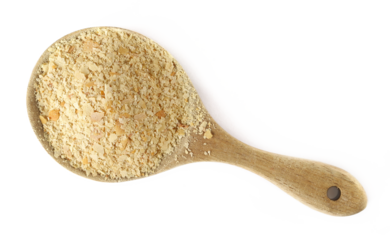 Nutritional yeast pile in wooden spoon (deactivated yeast) isolated on white, top view