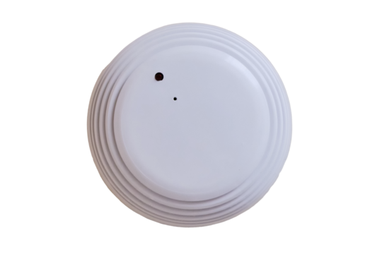 Smoke detector of fire alarm, the white background of the wall, isolated on a white background. Sensor on beige ceiling, isolated on a white background. Smoke fire alarm in the inactive state.