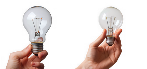 Two incandescent light bulbs held by hands showcasing simple illumination and design on transparent background