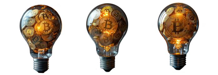 A collection of glowing incandescent light bulbs suspended in darkness isolated on transparent background
