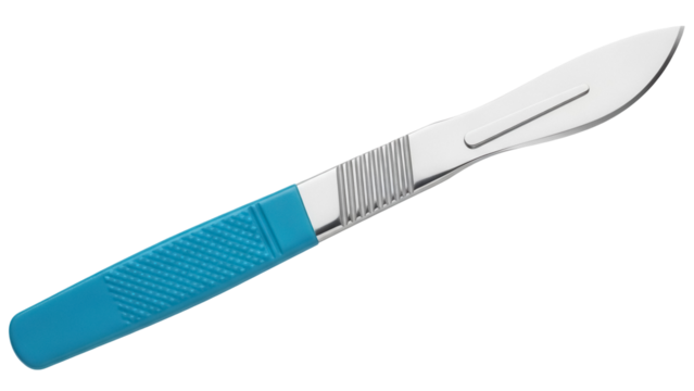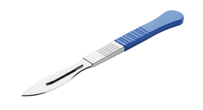 Metal surgical scalpel tool with sharp blade and textured handle isolated on a transparent background