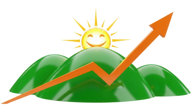 Optimistic growth chart with smiling sun over green hills isolated PNG, positive trend concept on transparent background