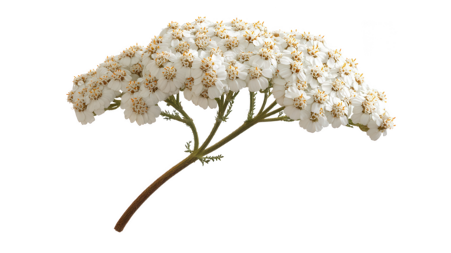 White common yarrow flower blossoms with delicate petals and golden centers gracefully displayed on a plain background