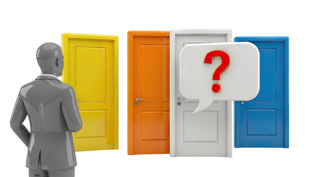 Man Facing Multiple Colored Doors with Question Mark Speech Bubble