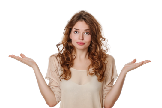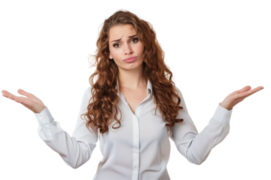 Woman shrugs,confused about something,PNG,transparent background,clipart.