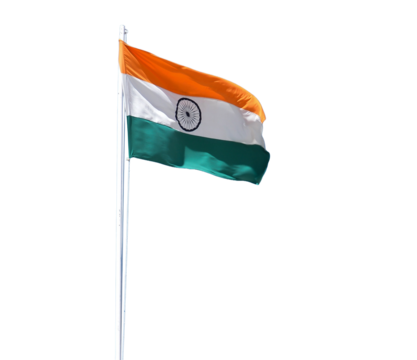 National flag of India on a flagpole, isolated on transparent background, png format.