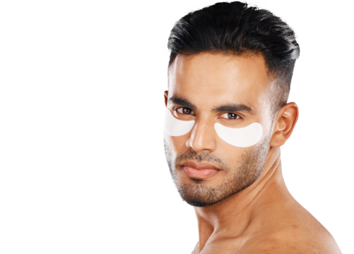 Eye patch, man and portrait for skincare, dermatology and aesthetic beauty isolated on a transparent png background. Face of serious indian model with gel mask for eyes, cosmetics and facial collagen