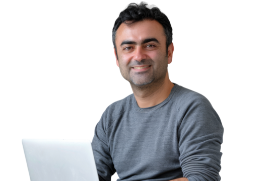 Smiling mid-age Indian man using a laptop.