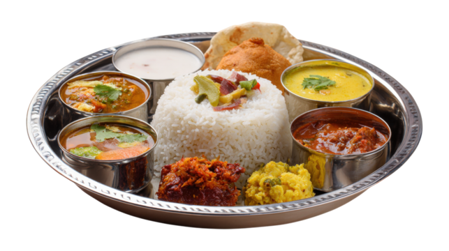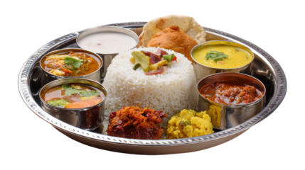 indian food thali with various curries, rice, naan, and dal isolated on transparent background