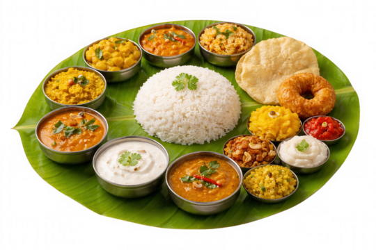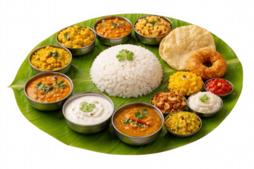 South indian thali featuring rice, curries, and various side dishes isolated on transparent background