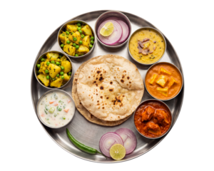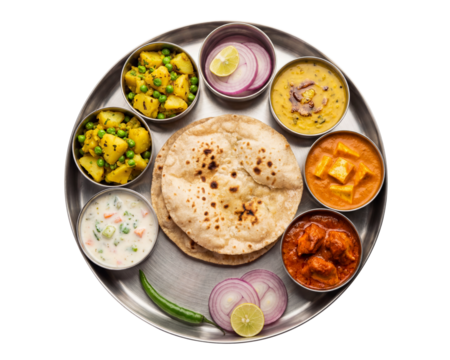 PNG image of Traditional North Indian vegetarian thali platter featuring roti paneer butter masala dal and aloo matar on transparent background