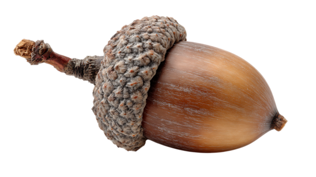 A single acorn, featuring a smooth, tan brown nut and a texture brown cap still attached to a short twig. The lighting should highlight the natural textures and subtle color variations of the acorn.