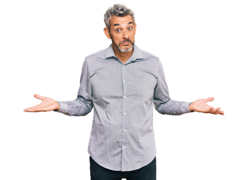 Middle age grey-haired man wearing casual clothes clueless and confused expression with arms and hands raised. doubt concept.